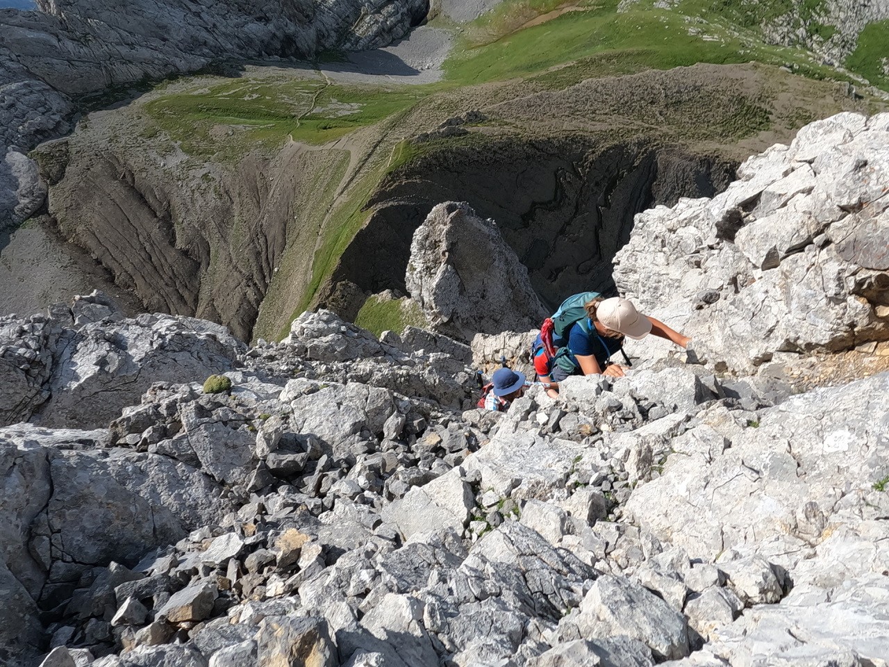 Die Besteigung ist weglos und mit Kletterstellen im I. Grad, aber gut machbar. 967 hm geschafft!! Weglos mit vielen Kraxelstellen ging´s weiter über den Grat zum Hüenerberg via Höchniden (2246m). Den Girenspitz ließen wir zunächst „links liegen“. Mit einem kurzen Abstieg kamen wir auf die Normalroute vom Schäffler zum Säntis. Eine kurze Mittagsrast und der Verzehr von Stullen und sonstigen Leckereien brachte verlorene Energie zurück.