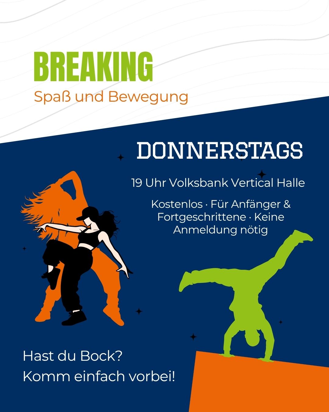 Bewegung, Musik, Style – ab sofort bieten wir mit Stefan ein offenes Breaking-Training (Breakdance) für alle an, die Lust auf kreative Bewegung und neue Skills haben.