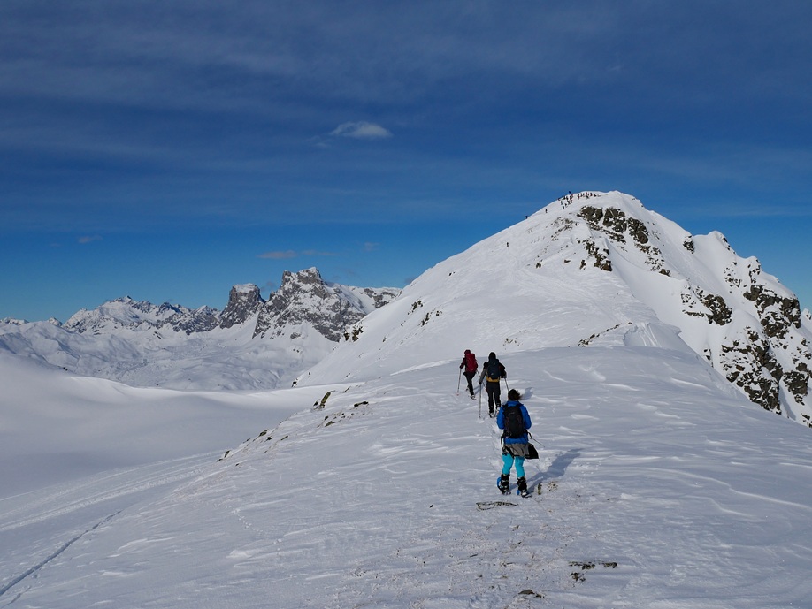 Vor uns breitet sich ein atemberaubendes 360-Grad-Panorama aus: unzählige Gipfel, eine unvergessliche weiße Landschaft, teilweise durchzogen von den Spuren anderer Skitourengeher, die von der Schweizer Seite aufgestiegen sind.